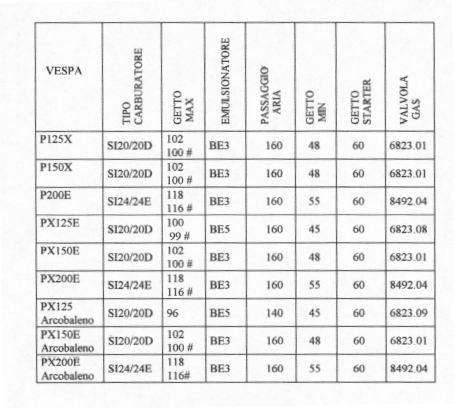 Come da oggetto non riesco a trovare una buona carburazione per il PX125E '82.. la configurazione è: carb SI20/20D, getto min 45-140 ,calibratore 160, emulsionatore BE5, getto max 100 (tutti come da originale Piaggio per il modello/anno). I problemi sono i seguenti: a basse velocità va a 4 tempi (come ho già postato qualche giorno fa, ma provando a diminuire il getto max non ho miglioramenti), attorno ai 50Km/m tende un po' a “tirare indietro”, poi, salendo di giri, va bene come fluidità di marcia ma attorno a 70-80km/k se mollo l'acceleratore e riprendo ha dei vuoti, tipo se "tirasse" troppa aria.. La vite dell'aria ho provato a regolarla ma con poco risultato..Ogni suggerimento è ben accetto!