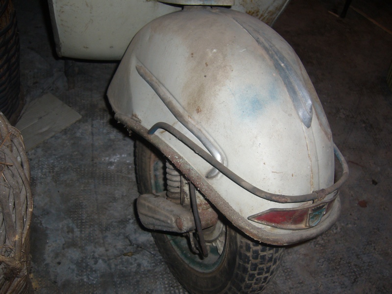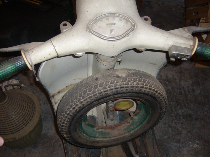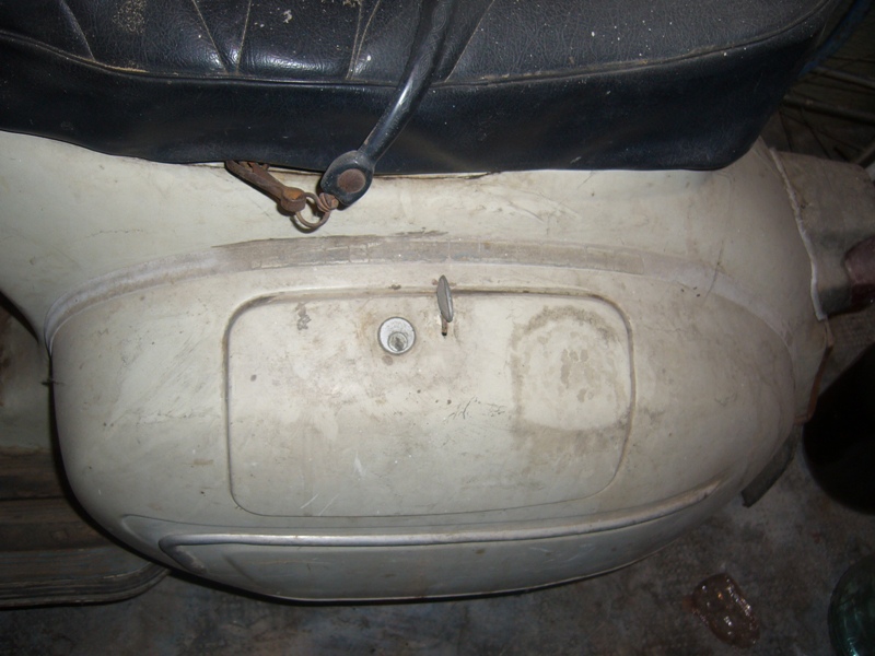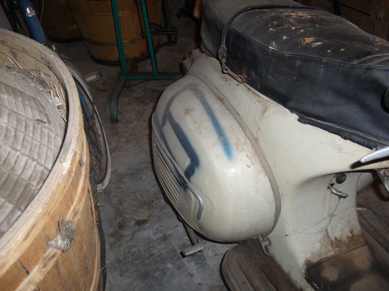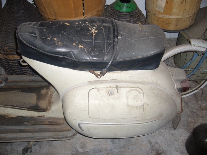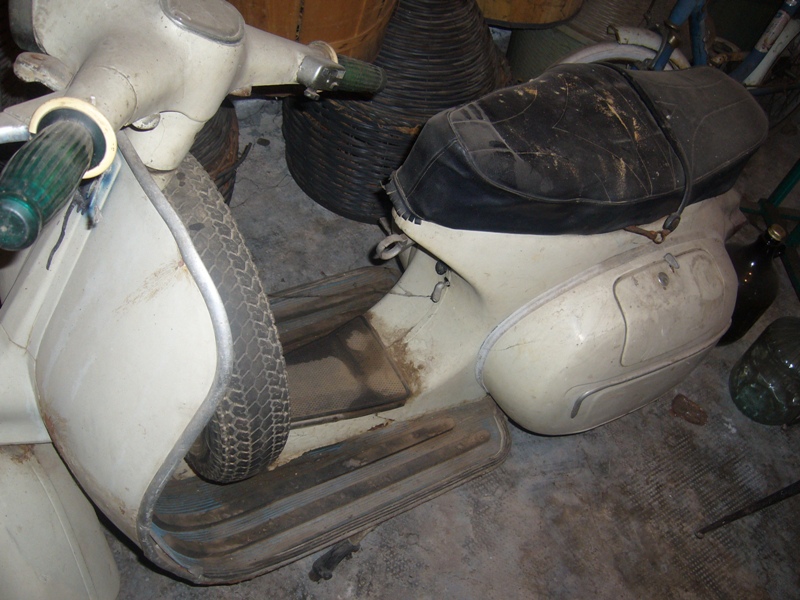 Ciao gente!Ho conosciuto un nuovo collega di lavoro e cosi' parlando guarda caso siamo caduti sul discorso VESPA e questo mi dice che suo zio possiede una vecchia vespa ferma da circa 30 anni in cantina. Dopo un'attimo di mancamento ho voluto subito sapere di che modello si trattava ma dopo alcune vaghe spiegazioni non sono riuscito a comprendere quale fosse il modello allora gli ho chiesto ser per cortesia mi faceva qualche foto ed ecco quà: