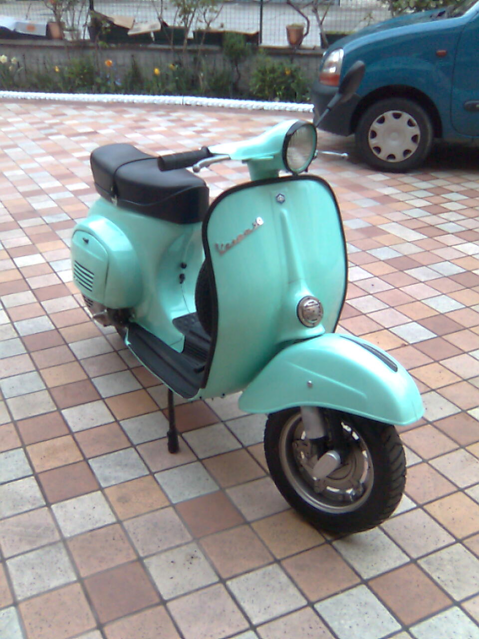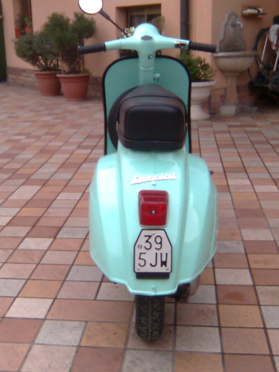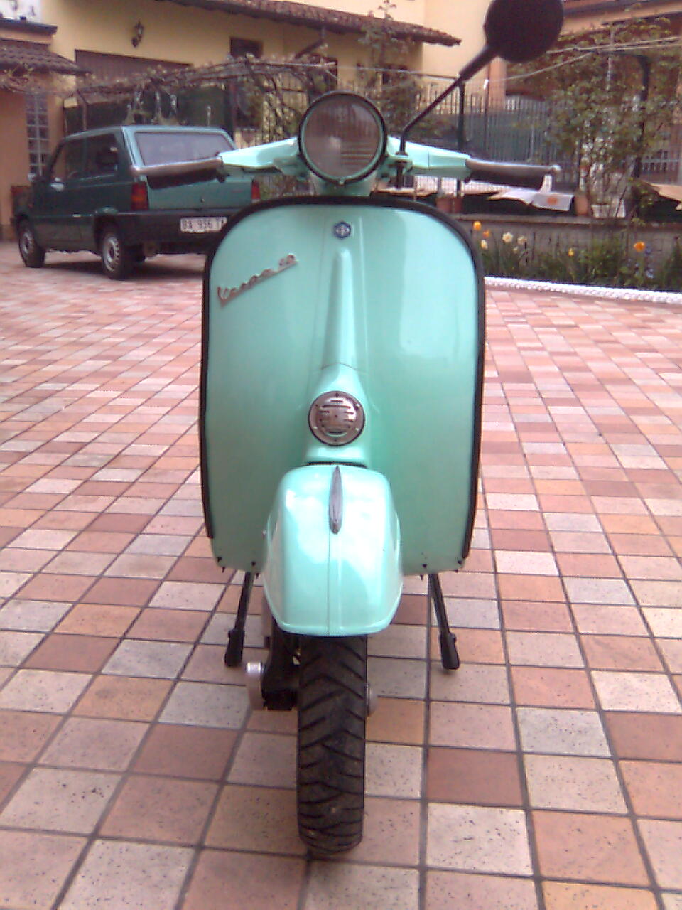 Ciao a tutti .. Ho 18 anni e sono uno studente. a 14 anni mi regalarono un moderno scooter di plastica che nel giro di breve mi stufò...infatti avevo sempre sognato una vespa!. l'occasione si presentò a maggio dello scorso anno quando mio zio mi disse che un suo cliente vendeva una special ad appena 300 euro. così mi fiondai ..la vidi e mi colpì subito così la portai a casa. la beffa nacque durante le operazioni di smontaggio necessarie per sostituire il cilidro 80 grippato.. notai che il n.di telaio era stato coperto per intero dalla vernice..la rimossi e con sorpresa scoprii che la vespa era una 50 R prima serie " specializzata in tutto e x tutto " ( chissa perchè ) !, il preced possessore non mi aveva imbrogliato però poiche sul librettino stava scritto " Piaggio Vespa 50 R ,ANNO 1969 "..COME HO FATTO A NN ACCORGERMENE????..va be.. dopo la crisi decisi che l'avrei riportata allo stato originale.. ovviaMENTE PER UN RAGAZZO DI 17 ANNI STUDENTE NON è SEMPLICE TROVARE " LA GRANA " per restaurare un vespino.. così passaioltre quattro mesi a risparmiare e poi cercare ogni parte ( manettone faro tondo, fanalerie, sella nuova, motore nuovo, pedane,cavi, guaine , impianto elettrico, commutatore,sportellino scritte ) iniziai il restauro tutto da solo a livello carrozzeria ( il motore lo feci fare da un ex capo reparto dlla piaggio amico di mio nonno una gran barva persona )la verniciatura è stata fatta da me dopo aver consultato un carroziere per precise istruzioni risultato : niente buccia d'arancia , pecca: colatura su parafango antriore poi sistemata perfettamente ... insomma PERFETTA contando che ero alle prime armi.. inoltre avevo precedentemente stuccato e levigato tutta la scocca. poi ho ribattuto con un punteruolo le scritte ( special poster l'ho tenuta perchè mi piaceva ) ed inoltre ho rimediato una sella per primavera nuova a soli 40 euro a un mercatino. Come potete notare il restauro non è terminato.. il contrasto cromatico nero-verdino è x me un deliro... ma sto procurando bordino cromato e ghiera faro... inoltre ho ordinato tutto il necessario per montare i cerchi da 9 pollici ( come noterete li mota da 10 )a 4 bulloni ( regalo di papa xk sono al verde ).. contando la mia inesperienza ed un anno di lavoro tutto solo credete che sia un buon risultato??