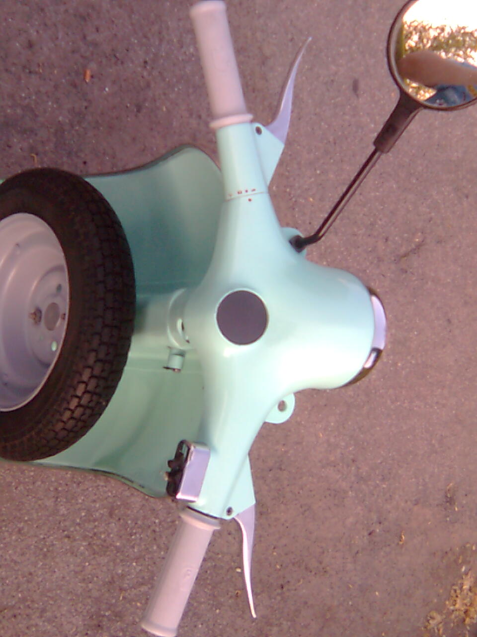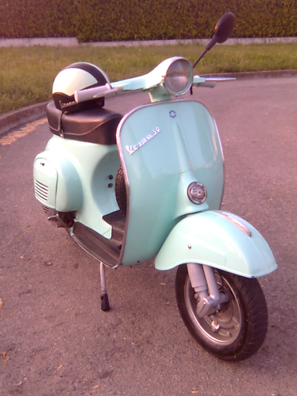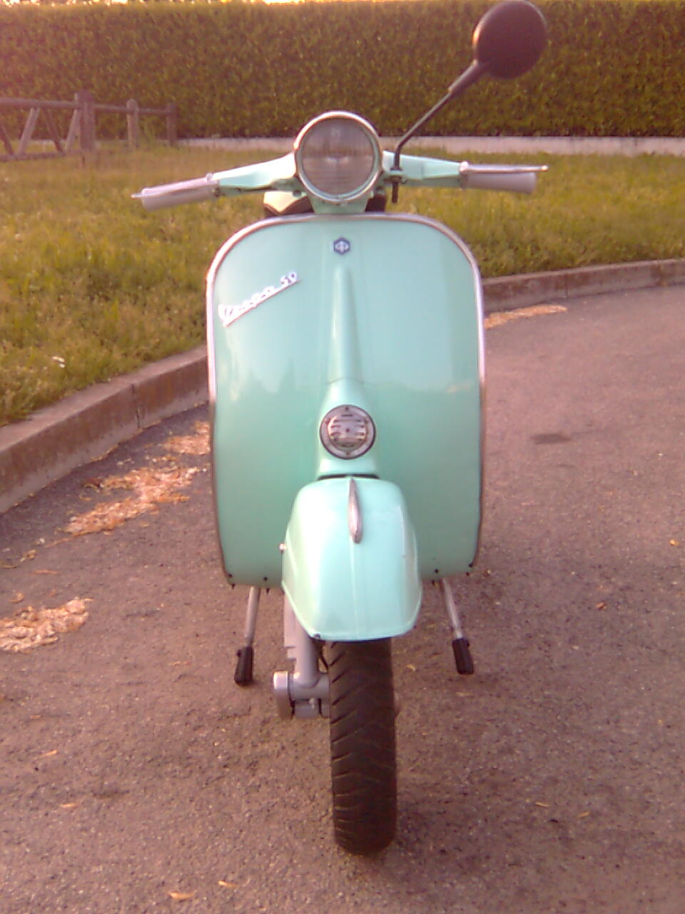 Ciao a tutti .. Ho 18 anni e sono uno studente. a 14 anni mi regalarono un moderno scooter di plastica che nel giro di breve mi stufò...infatti avevo sempre sognato una vespa!. l'occasione si presentò a maggio dello scorso anno quando mio zio mi disse che un suo cliente vendeva una special ad appena 300 euro. così mi fiondai ..la vidi e mi colpì subito così la portai a casa. la beffa nacque durante le operazioni di smontaggio necessarie per sostituire il cilidro 80 grippato.. notai che il n.di telaio era stato coperto per intero dalla vernice..la rimossi e con sorpresa scoprii che la vespa era una 50 R prima serie " specializzata in tutto e x tutto " ( chissa perchè ) !, il preced possessore non mi aveva imbrogliato però poiche sul librettino stava scritto " Piaggio Vespa 50 R ,ANNO 1969 "..COME HO FATTO A NN ACCORGERMENE????..va be.. dopo la crisi decisi che l'avrei riportata allo stato originale.. ovviaMENTE PER UN RAGAZZO DI 17 ANNI STUDENTE NON è SEMPLICE TROVARE " LA GRANA " per restaurare un vespino.. così passaioltre quattro mesi a risparmiare e poi cercare ogni parte ( manettone faro tondo, fanalerie, sella nuova, motore nuovo, pedane,cavi, guaine , impianto elettrico, commutatore,sportellino scritte ) iniziai il restauro tutto da solo a livello carrozzeria ( il motore lo feci fare da un ex capo reparto dlla piaggio amico di mio nonno una gran barva persona )la verniciatura è stata fatta da me dopo aver consultato un carroziere per precise istruzioni risultato : niente buccia d'arancia , pecca: colatura su parafango antriore poi sistemata perfettamente ... insomma PERFETTA contando che ero alle prime armi.. inoltre avevo precedentemente stuccato e levigato tutta la scocca. poi ho ribattuto con un punteruolo le scritte ( special poster l'ho tenuta perchè mi piaceva ) ed inoltre ho rimediato una sella per primavera nuova a soli 40 euro a un mercatino. Come potete notare il restauro non è terminato.. il contrasto cromatico nero-verdino è x me un deliro... ma sto procurando bordino cromato e ghiera faro... inoltre ho ordinato tutto il necessario per montare i cerchi da 9 pollici ( come noterete li mota da 10 )a 4 bulloni ( regalo di papa xk sono al verde ).. contando la mia inesperienza ed un anno di lavoro tutto solo credete che sia un buon risultato??
