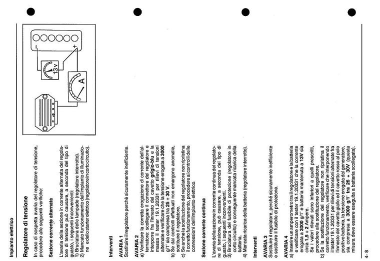 | da libretoo uso e manutenzione si parla di una tensione alternata in arrivo al regolatore di 25/30 volt a 3000 giri, a questo punto dopo aver sostituito a cavi riprova e misura nuovamente, potrebbe essere o il regolatore o una bobina sullo statore che ha qualche spira in corto, se puoi fatti prestare un regolatoree prova...... dopodichè se la tensione bassa persiste occorre mettere mano alle bobine sullo statore........ |