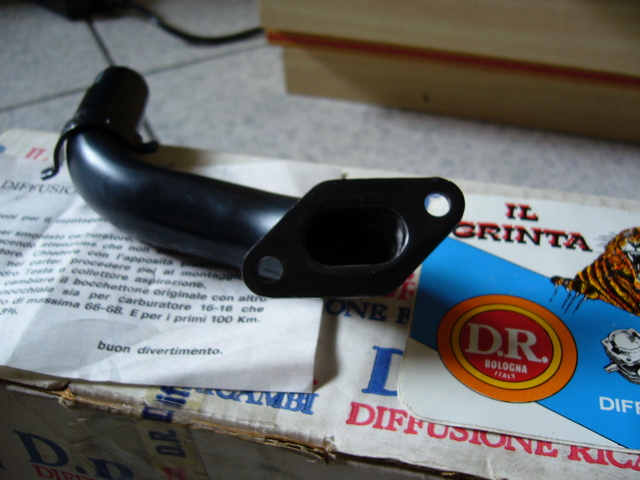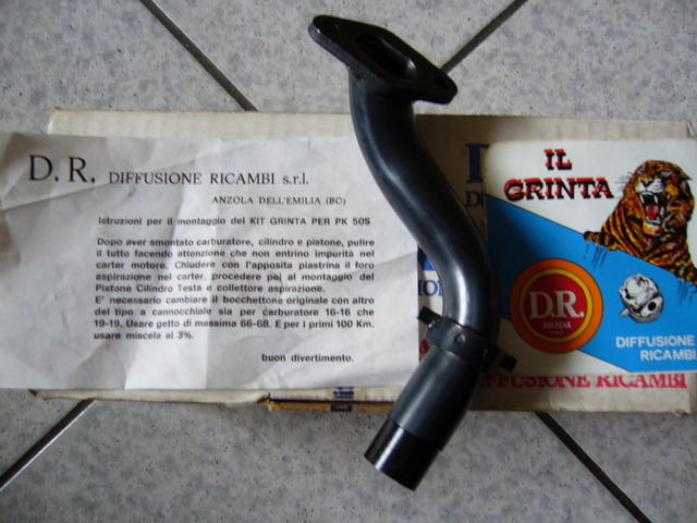 Il DR grinta č ormai molto raro, č completamente diverso dal normale 102 dr per il fatto che trattasi di un "piston ported", ovvero con l'aspirazione diretta nel cilindro, occorre pertanto utilizzare l'apposito collettore (visibile nella foto) e chiudere con la piastrina il foro sul carter (un pō come col 132 Malossi). Io ne ho uno nuovo nuovo, acquistato qualche tempo fa su ebay..e me lo tengo stretto (in attesa di qualche utilizzo futuro...) |
