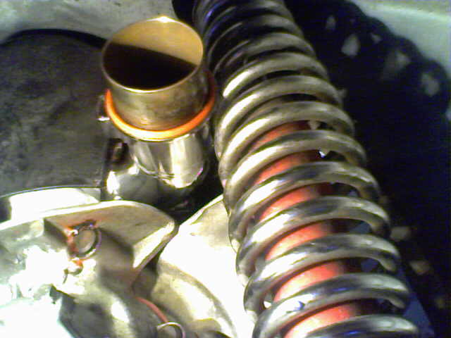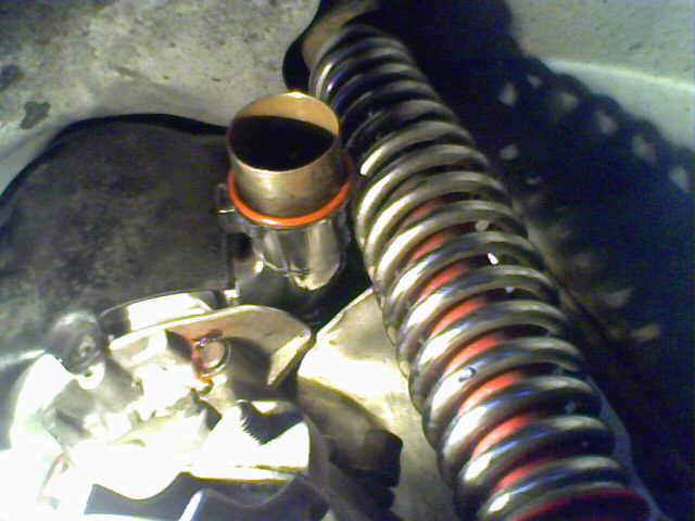 Zaza ma che mi hai preso per un novellino?la mia molla era giā cromata  (credo sia d'acciaio),ecco la foto,come vedete tocca appena e va leggermente di lato,col calibro manuale la spirale ha una larghezza massima di 6,4 cm.Ho un'altro ammortizzatore con la molla piu'stretta che misura 5,6 cm.In pratica 8mm in meno cioč ne recupererei 4 dal centro,forse potrebbero bastare ma questo ammortizzatore ha il filetto rovinato e non posso montarlo,dovrei vedere se č possibile smontare le 2 molle e invertirle,comunque per provare le distanze va bene. Non ho avuto tempo di guardare,sapete se si smontano sti ammortizzatori? Perchč Bruno mi suggerisce un'ammo. per pk?forse sono piu' stretti?in questo caso quelli del link che ho messo dovrebbero andare bene,pero' non suggeritemi modelli senza molla che sono proprio brutti,mi sanno di deboli...