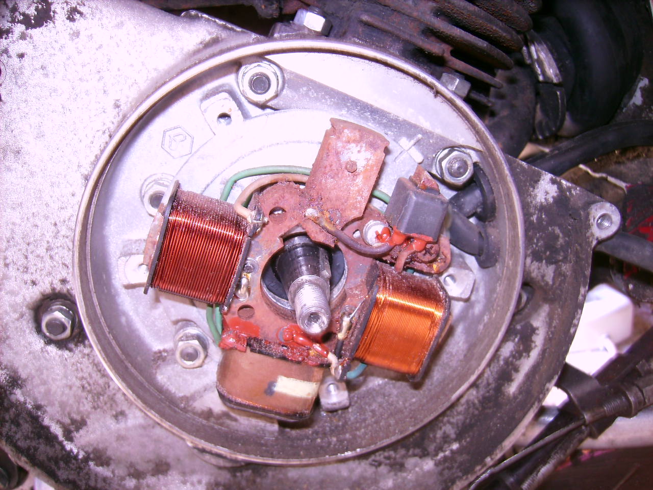 Eggrazzie che non faceva la scintilla!!!  Ovviamente ho gia dissaldato tutti i cavi per sostituirli, ma... Che dite, uno statore ridotto così puo andare? C'è qualche trucchetto per dargli almeno una pulita dalla ruggine?