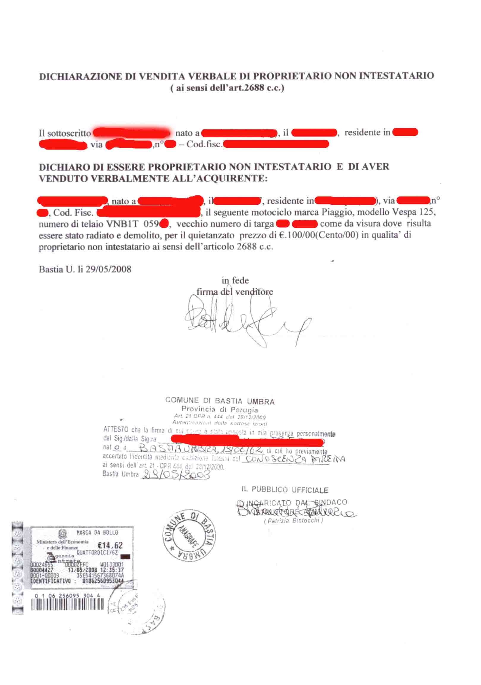 Dichiara con la presente di ver venduto in data odierna il seguente veicolo Marca e tipo: PIAGGIO VESPA 125 Targa: XXXXXX Telaio: XXXXX Potenza HP: 2 Cilindrata: 123.7