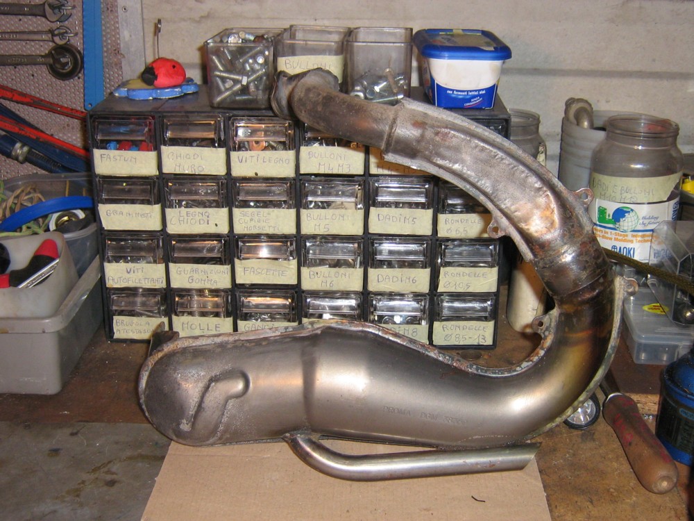 ciao a tutti! finalmente oggi pomeriggio io e mio papà abbiamo guardato come adattare la proma per special o et3 su telaio pk senza tagliare la paratia: con alcune mertellate abbiamo appiattito il collettore originale, successivamente abbiamo tagliato 5cm di collettore facendolo diventare a corsa corta ecco qui: