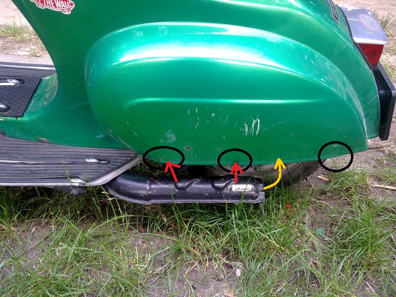 nella foto allegata si può notare il movimento della marmitta verso su(freccia gialla) quando si prende una buca,da soli o in due, la prima crepa che mi si è fatta,quella centrale, è dovuta a una classica salita per salire sui marciapiedi con le bici. Gli altri segni sono duvuti ad uno scontro con una Y elefantino blu... ma con il tempo,la foto è di quest'estate, le crepe si sono ingrandite e questo credo sia dovuto al fatto che con due passeggeri la marmitta sta molto vicino alla pancia... comunque io la sufficienza a questa marmitta la darei... magari anche un 7...