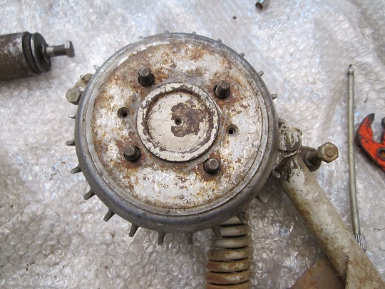 2) si toglie il tondo metallico che sta all'interno del quadrato delle viti, quello che indico nella foto 2 con un dito? Quel tondo è tutto un pezzo con il mozzo dove sono fissate le 4 barre filettate che vedi lì. E' proprio su questo tondo che ho battuto.
