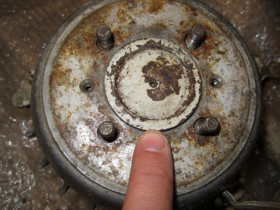 Ancora qui con il solito bisogno di voi. Sono quasi al dunque, mi manca giusto un paio di dettagli per presentarmi alla sabbiatura. Aiutatemi. 1) Come si smonta il copri-freno anteriore, cioè quel coperchio simile ad un tappo di bottiglia della foto 1? non ho il termine esatto... 2) si toglie il tondo metallico che sta all'interno del quadrato delle viti, quello che indico nella foto 2 con un dito? 3) Come si sfila il perno filettato (foto 3), alla cui base intravvedo dei cuscinetti? 4) Che razza di bestia mi ha divorato il supporto alla base del perno in foto 4? è normale che sia così?