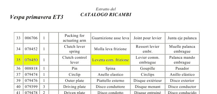 Si è staccata la leva dalla boccola spinata sul perno, e quindi gira a vuoto. In Piaggio il pezzo non è più ordinabile, e sui vari webstore non l'ho trovato.