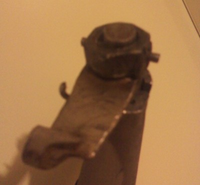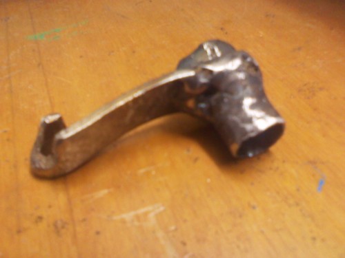 Ho quindi pensato di prendere un tubetto di ferro di dimensioni opportune, saldargli sopra una piattina, da ripiegare e molare per darle la forma giusta. Poi (mia idea libidinosa) saldare sopra un dado per avere una presa esagonale da utilizzare con una chiave per tirare la levetta quando si vuole calzare o scalzare il cavetto. Infine, ripassare tutto l'accrocchio col trapano a colonna per creare il foro passante, molare, lucidare e completare con foro trasversale per il fissaggio. Il prototipo però non è riuscito al meglio perché saldando la piattina sul tubo, quest'ultimo si è un po' deformato sull'interno, e, quando ho provato a ripristinare il diametro del foro passante, la punta si è appena appena disassata e ha allargato troppo il foro stesso, dimodoché ora il mio accrocchio balla sul perno. No problem, farò un secondo tentativo partendo da una barretta piena e lavorando il foro passante solo alla fine. Queste le foto del primo tentativo (ovviamente non rifinito perché è inutile):
