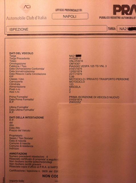 So che ci sono una serie di cose non originali (faro posteriore, bordo scudo, rivestimento sella, gomma cofani e bauletto, fregio parafango ed altro) ma per il momento la uso alla grande, poi verso ottobre inizio il restauro... anche perché la mia collega di studio venerdì ha pensato bene di buttarla a terra mentre faceva manovra con il suv, risultato: la piccolina ha due bei bozzi su entrambi i cofani (le foto postate ovviamente sono precedenti all'accaduto) e diversi graffi... vabbé la prendo con filosofia... tanto in autunno...