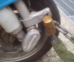 però a mia discolpa devo dire che questa Primavera è stata rubata e ritrovata due volte, e per la paura del "non c'è due senza tre" ho accrocchiato quello che vedete. Ma almeno è reversibile, perché è solo stretto sulla forcella e viene via con un colpetto di flex.