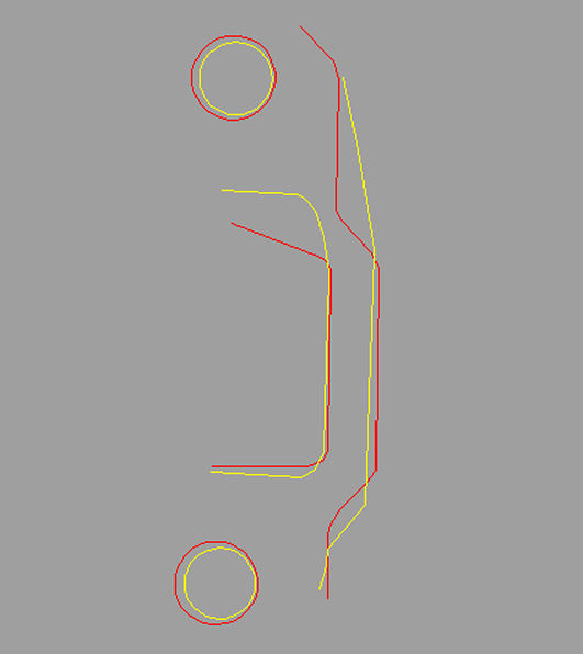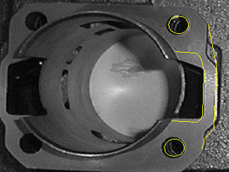In questa immagine si vede il 130 polini, e i segni in giallo sono il profilo dei travasi del 132 malossi, quindi la forma dei miei carter....c'e' un po di differenza...purtroppo in un punto rimarra' poco materiale... Il profilo e' stato ricavato da un'altra foto e poi messo in scala, quindi non e' preciso al 100% ,ma si avvicina abbastanza visto che le 2 foto(polini e malossi) erano state scattate con la stessa inclinazione.