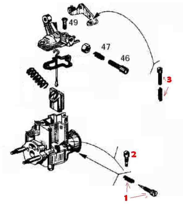 allora la vite 1 regola la carburazione al minimo,quindi se la avviti(ovvero smagrisce) entrando piu aria il minimo si alza ma la carburazione risulta magra e quindi pericolosa.