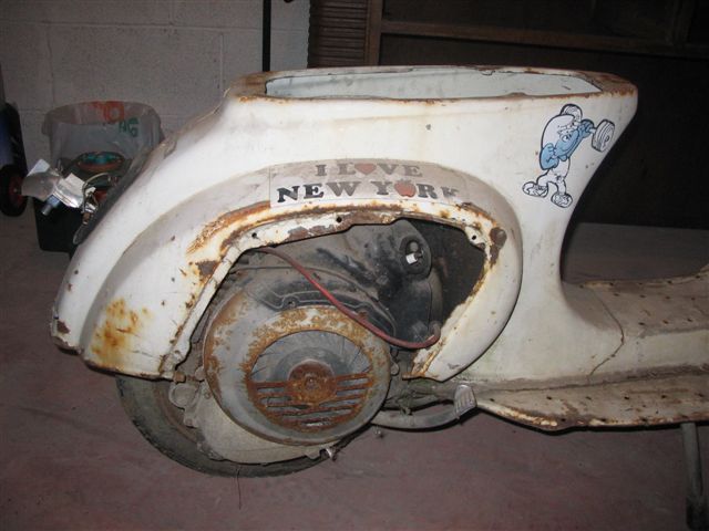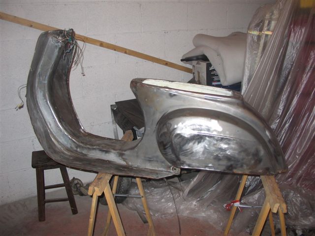 Spazzola a ferro a tortiglioni per frullino misura del 25 e vedi che avrai ragione delle pedane sotto, in coda evita che se si incastra ti amputi una mano, dagli di carta vetrata rossa e tanta pazienza e poi ferox a litri spennellato, la ferma e pure bene e puoi dargli il fondo grigio chiaro sopra senza problemi (se non lo trovi aggiungici del nero e diventa grigio chiaro), il pedale freno toglilo se ammacchi poi ribatti usa la forza e la tenacia, per il nasiono, tiralo fuori e ribattilo bene, ridata la sagoma, con tanta pazienza, fai fare una saldatura a riempire e spianala con disco a ferro spesso da molatura sempre per il frullino, stucca e spiana due volte e risorge, come ricambio non si trova e non so dove tu possa trovarlo, salda tutti gli spacchi i fori targa le crepe sui sostegni pedana e fai colare a fiamma del ferro sul bordo della coda, sempre frullino a spianare e ricostruisci, non mi crederai ma quel telaio è messo bene!!!