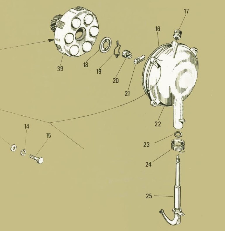 ignora il gruppo 39 ed i pezzi 18-19, sono il pacco frizionee la piastra di spinta, quelli rimangono sugli ingranaggi e non ti interessano se perdi olio dall'alberino del coperchio...