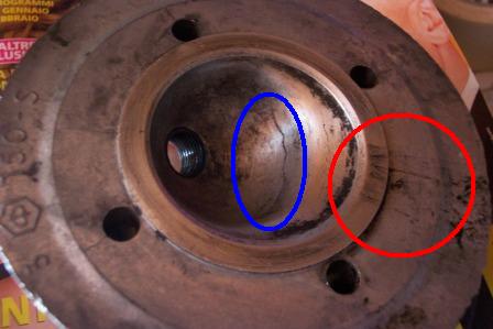 Nel cerchio rosso la cosa più preoccupante: una serie di fratture a "raggera", non sono profondissime, ma da li il motore piscia un sacco di morchia nera tanto che quando ho smontato la testata c'era ancora la goccia appesa! l'ho pulita perchè si vedesse bene il tutto! NEl cerchio blu una specie di faglia di S.Andrea che però non mi preoccupa più di tanto. Il mio dubbio è che dalla frattura in rosso vi siano delle perdite di aria e nella camera la miscela non bruci completamente! di seguito le foto dei particolari: